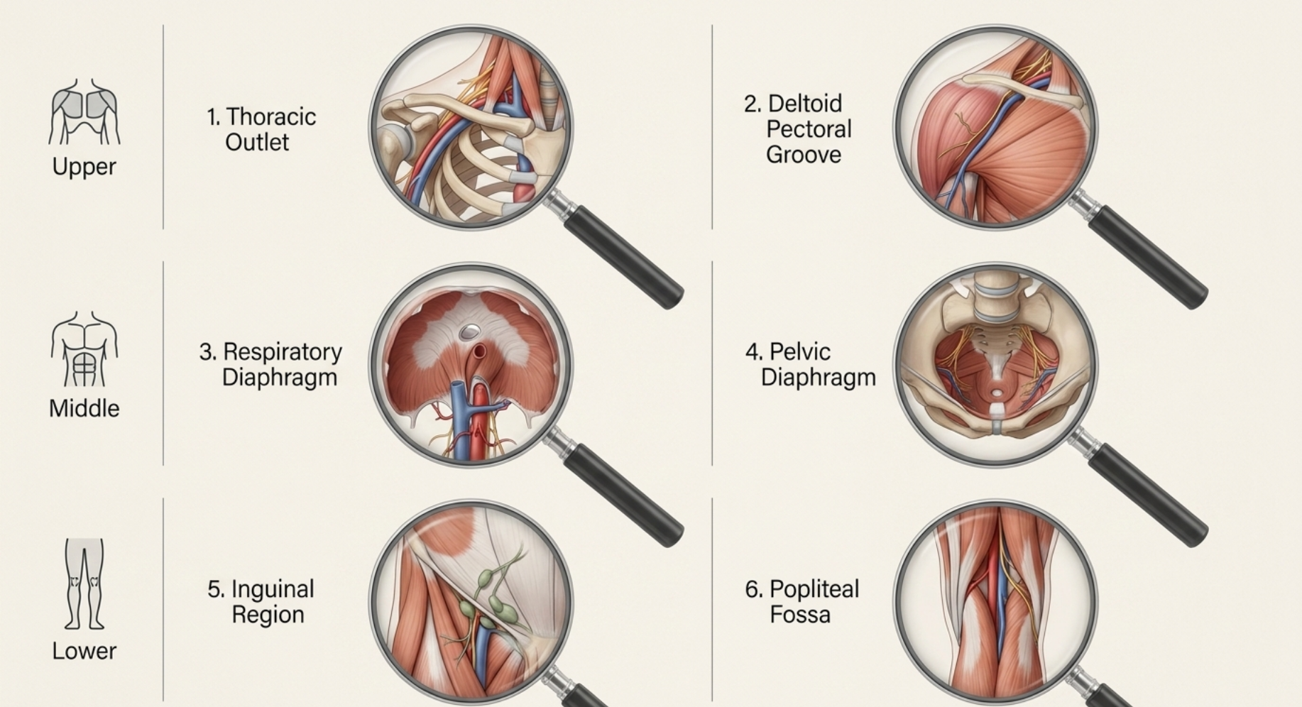 The ones we think about often are the thoracic outlet, the respiratory diaphragm, the pelvic diaphragm, the femoral triangle, and the popliteal fossa. Each one serves as a key passage point. Each one can be influenced by lifestyle, training, stress, work posture, and even sleeping position. Each one can become a place where the body starts to slow down, stiffen up, and protect itself.